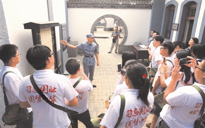 由共青团中央、全国青联主办,共青团陕西省委、陕西省青联承办的“重走抗战路、青春向延安”全国优秀青年代表纪念抗战胜利70周年主题活动在八路军西安办事处纪念馆启动。来自全国各地、各行各业的70名优秀青年代表将在未来5天内重走延安抗战路线。图为7月9日,青年代表们在参观八路军西安办事处纪念馆。