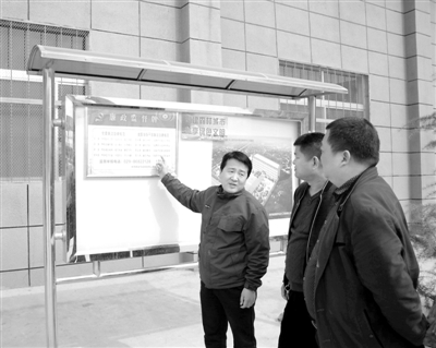 陕西省西安市关山镇纪委在全镇27个行政村设立写有两项法规主要内容的“廉政监督牌”,并公布信访举报电话,方便广大群众以党规党纪标准监督党员干部,发现问题及时举报。图为3月2日,该镇纪委工作人员向村民讲解“廉政监督牌”有关内容。