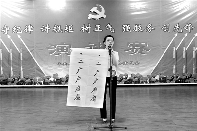 陕西省西安市周至县组织“守纪律、讲规矩、树正气、强服务、创先锋”主题演讲活动,旨在深入推进“两学一做”学习教育,夯实党员干部的纪律意识和规矩意识。图为演讲者以“廉”“腐”两字写法为引,讲述廉洁的重要性。