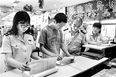 中秋、国庆双节来临之际,陕西省永寿县纪委与国税、地税、市场监管等相关职能部门组成联合检查组,对公车管理使用、公款购卡购物等,全方位展开监督检查,对发现的问题线索逐一核查。图为检查组人员在超市查看公款购物发票底单。