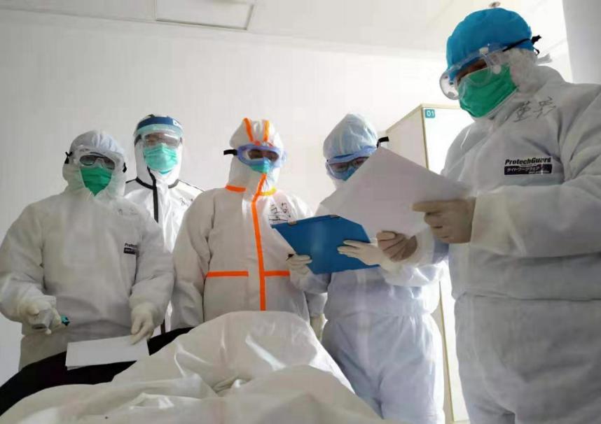 武汉市江夏区第一人民医院呼吸与危重症医学科5病区,江苏医疗团队与发热5病区战友在查房。(武汉市江夏区纪委监委供 陈林 摄)