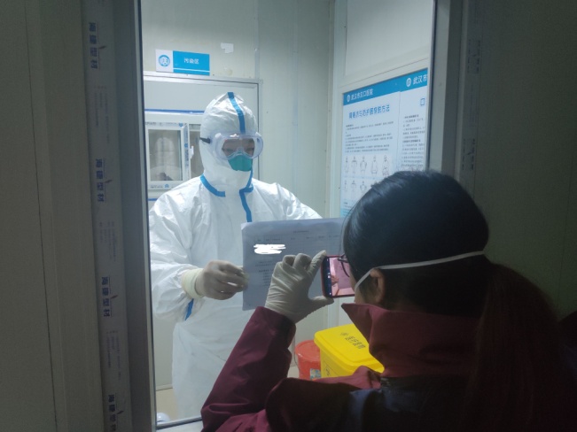 武汉市江岸区疾控中心流调队员在病房污染区隔着玻璃将流调表信息传递给战友。(武汉市江岸区纪委监委供 李康 摄)