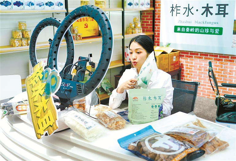 图为柞水县小岭镇金米村现代农业产业园区一间直播间内,一名主播正在直播推销木耳产品。新华社记者 邵瑞 摄