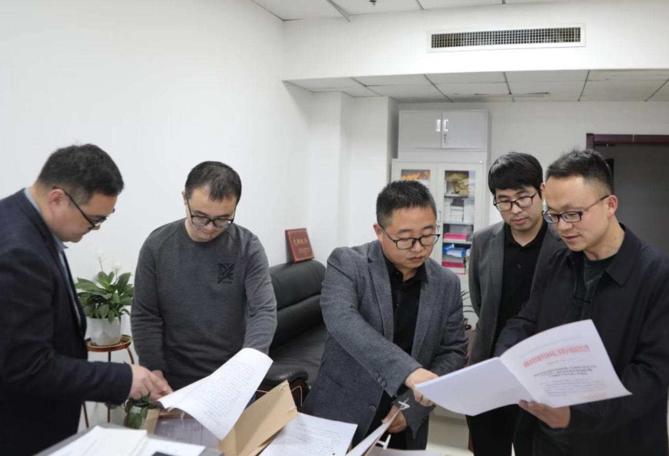 图为张洋彪(中)正在与同事讨论相关工作。王信 摄