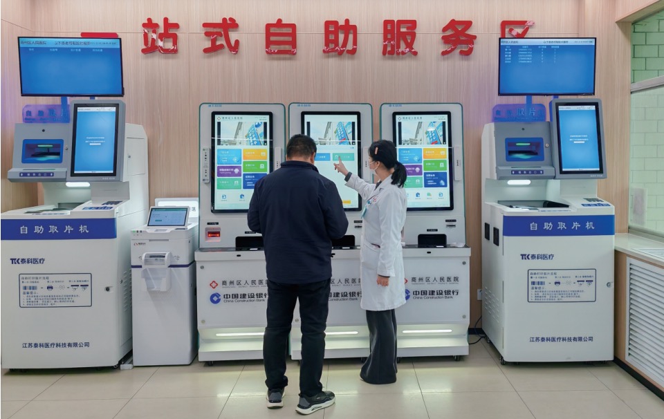 商州区人民医院工作人员在一站式自助服务区指导患者使用自助服务终端。周艳 摄