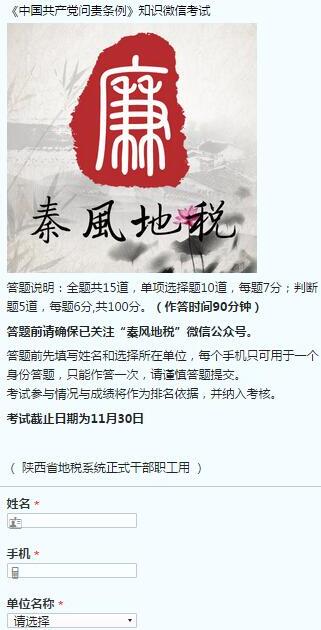 《中国共产党问责条例》颁布后,全省地税系统迅速掀起了学习贯彻的热潮。近日,为检验学习成果,中共陕西省纪委驻省地方税务局纪检组在全省地税系统干部职工中组织开展了《问责条例》知识微信考试。考试在微信公众平台“秦风地税”中开发独立答题考试的H5页面,面向全省地税系统干部职工组织开展答题活动,并明确提出要求,确保各单位统一思想,提高认识,全员积极参与微信答题考试,并将参与微信考试情况和成绩纳入年终考核。