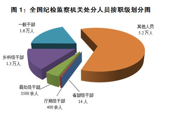 2017年第一季度,全国纪检监察机关共接受信访举报62.3万件次,处置问题线索19.4万件,谈话函询3.8万件次,立案10.2万件,处分8.5万人(其中党纪处分7.1万人)。处分省部级干部14人,厅局级干部400余人,县处级干部3500余人,乡科级干部1.3万人,一般干部1.6万人,农村、企业等其他人员5.2万人。