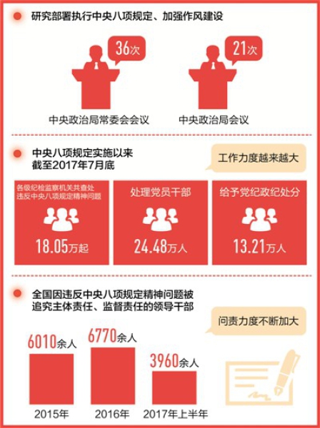 5年来,无论是在改进调查研究、精简会议活动、精简文件简报方面,还是在规范出访活动、改进警卫工作等方面,党中央都认真贯彻执行八项规定,推动作风建设取得扎实成效。