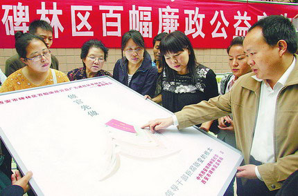 9月11日,碑林区纪委党风室陈嵘向张家村鸿雁社区群众讲解获得全国廉政公益广告一等奖《做官先做人》内容。当日,西安市碑林区160幅廉政公益广告走进社区,与群众面对面。这些廉政公益广告由当代楷模、廉政格言、廉政故事等6部分组成,集思想性、艺术性、教育性为一体,具有较强的亲和力、渗透力和感染力,深受社区群众的欢迎。据悉,在未来一年时间里,这些廉政公益广告将走进百家社区巡展。