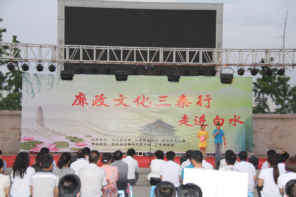 为了进一步扩大廉政文化的覆盖面和影响力,促进党的群众路线教育活动深入开展,2014年6月18日下午7点,由省纪委、省监察厅、省文化厅联合举办的“廉政文化三秦行”文艺演出在我县仓颉广场举行。县委常委、纪委书记郭世英致辞,白水县四大班子及其它在家县级领导、各单位部分党员干部和广大群众2000余人观看了演出。
