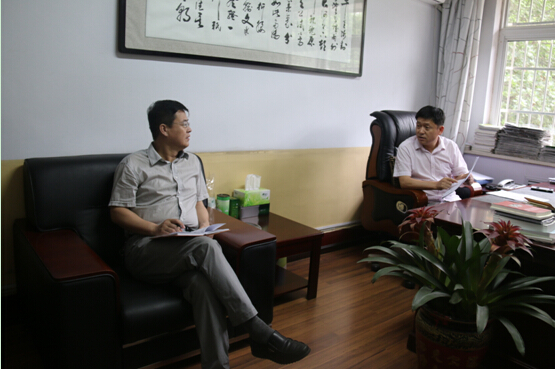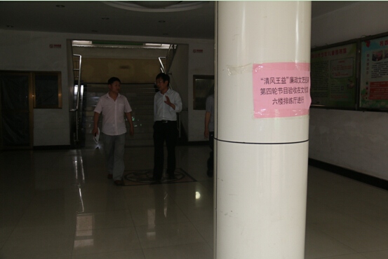 5月31日上午8:20 在前往验收活动所在地—区文化馆排练厅前,区纪委书记刘战杰与区纪委副书记、监察局长姚金全就今天廉政文艺演出节目验收活动工作细节作进一步商讨,安排节目点评、选择等工作。