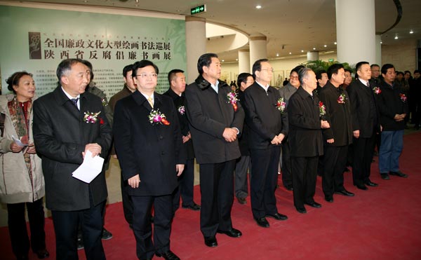 为纪念党的纪律检查机关恢复重建30周年,由省纪委监察厅主办、陕西延长石油(集团)有限责任公司协办的全国廉政文化大型绘画书法巡展暨陕西省反腐倡廉书画展12月29日下午在陕西省美术馆开幕。省政协原主席周雅光,省委常委、省纪委书记郭永平,副省长景俊海,省政协副主席李进权,省委原副书记董雷,省纪委副书记、监察厅长龚汉江,省纪委副书记魏燕,省监察厅副厅长岳崇,省纪委常委、监察厅副厅长贠军,省纪委常委高山,省纪委秘书长、监察厅副厅长马奔等出席开幕式并参观了展览。