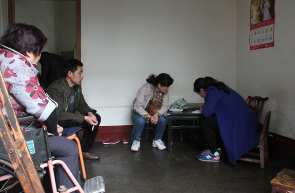 图6、早10:40:走访一户残疾老人,在其家中现场做起调查记录。这位老人患神经性脊椎炎多年,坐在轮椅上,我们向她在了解情况后,她又和我们反映之前享有的低保今年被取消的事情,镇民政干部又详细的为她讲解新的有关政策。