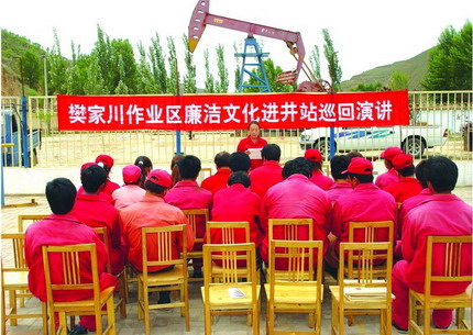 一方热土,创造一个奇迹; 一个理念,历练一种品德; 一种文化,吹来一面清风。 “廉洁的官吃得香睡得甜,廉洁的官能开万里船,廉洁的官老百姓最喜欢……”每当哼起这首由采油二厂员工自己创作、并获得中石油廉洁歌曲大赛优秀奖的歌曲时,长庆油田采油二厂西33管理单元党支部书记杨立峰的脸上便露出自豪的笑容:“这首歌,真唱到人心里去了,员工爱唱,大家爱听,都成了我们这儿每次文艺演出的必唱曲目了。”这只是采油二厂廉洁文化建设的一个缩影,员工通过参与丰富多彩的廉洁文化活动,将廉洁理念渗透到每个人的心里。 走进第三采油厂虎狼峁采油作业区,一幅幅醒目、庄重的标牌、展板,一条条铿锵有力的豪言警句就展现在人们的眼前——“以廉为荣、以贪为耻;廉洁奉公、忠诚企业”,“为国家奉献石油,在深山建功立业”……所有这一切,并不仅仅是理念的宣示,更是广大干部员工心声的表达和精神的追求,是廉洁文化所凝聚起来的人心、士气的展露。