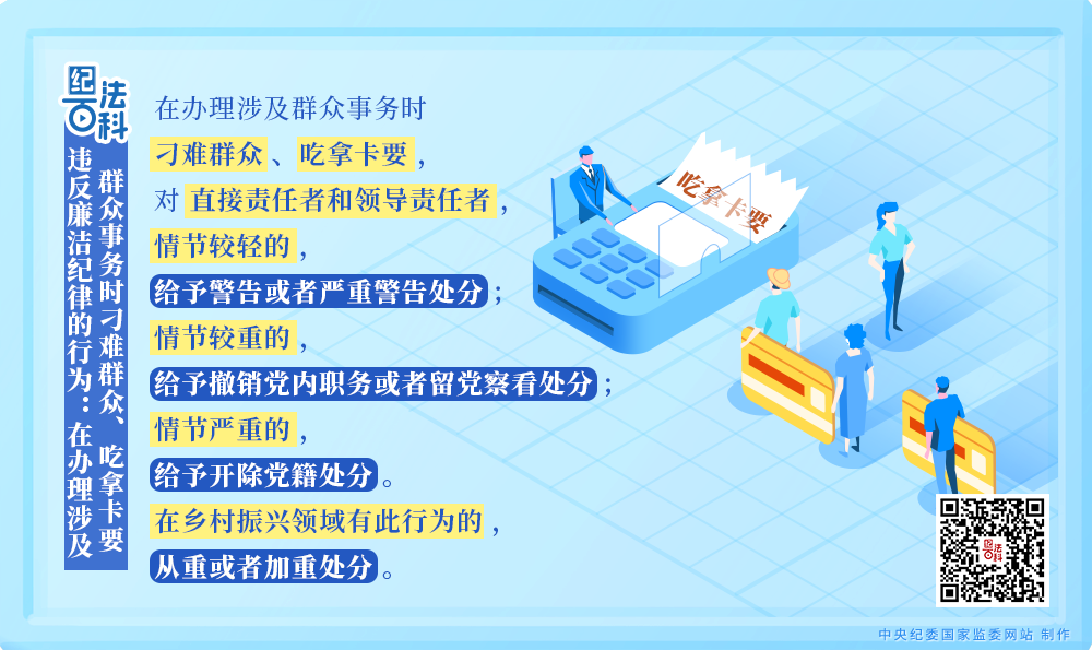 《中国共产党纪律处分条例》第一百二十二条规定,在办理涉及群众事务时刁难群众、吃拿卡要,对直接责任者和领导责任者,情节较轻的,给予警告或者严重警告处分;情节较重的,给予撤销党内职务或者留党察看处分;情节严重的,给予开除党籍处分。
