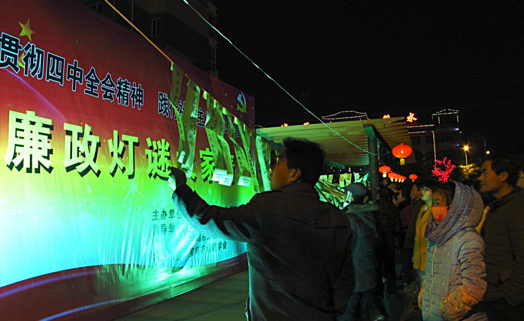 元宵佳节前夕,陕西省宝鸡市纪委在全市举办多场以廉政为题材的猜灯谜活动,使广大党员干部群众在娱乐的同时,进一步加深对党纪法规的理解。图为3月4日,群众在猜廉政灯谜。