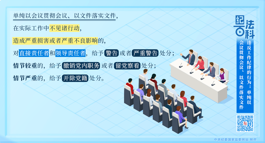 《中国共产党纪律处分条例》第一百三十二条对形式主义、官僚主义突出问题有针对性作出处分规定。单纯以会议贯彻会议、以文件落实文件,在实际工作中不见诸行动,造成严重损害或者严重不良影响的,对直接责任者和领导责任者,给予警告或者严重警告处分;情节较重的,给予撤销党内职务或者留党察看处分;情节严重的,给予开除党籍处分。