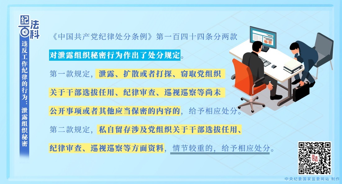“严守党的纪律,保守党的秘密”,是每名党员入党宣誓时的郑重承诺。无论选人用人工作、纪律审查工作,还是巡视巡察等工作,都有严格的保密纪律。《党政领导干部选拔任用工作条例》规定,选拔任用党政领导干部,不准私自泄露研判、动议、民主推荐、民主测评、考察、酝酿、讨论决定干部等有关情况。《中国共产党纪律检查机关监督执纪工作规则》规定,监督执纪人员不准私自留存问题线索和涉案资料,严禁泄露审查调查工作情况,对纪检干部私存线索、跑风漏气、违反安全保密规定等违纪行为要严肃处理。《中国共产党巡视工作条例》规定,巡视工作人员私自留存巡视工作资料,泄露与巡视工作有关的未公开信息的,要给予处理处分。