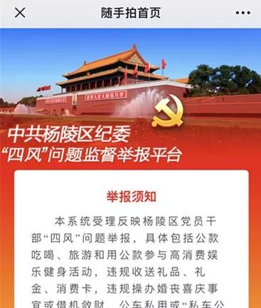 依托“廉洁杨陵”微信公众号,打造了“四风”问题“随手拍”平台,主要受理对党员干部和其他公职人员“四风”问题的监督举报,群众可以随时随地通过手机拍下发生在身边的“四风”问题,上传图片或视频文件,实现“一键举报”。
