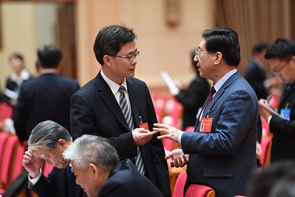 1月13日上午,十九届中央纪委三次全会举行第三次大会。中央纪委委员,海南省纪委书记、省监委主任蓝佛安(左)与中央纪委委员、国家卫生健康委员会副主任曾益新在会前就学习习近平总书记重要讲话进行交流。(中央纪委国家监委网站 徐梦龙 摄)