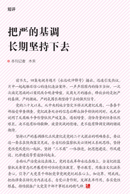 严,是我们党的鲜亮底色,也是全面从严治党的关键所在。陕西各级纪检监察机关纠治“四风”不停歇不松劲,从严处置违纪行为,推进作风建设常态化长效化。
