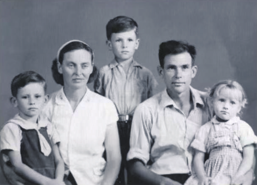 1960年,阳早、寒春与孩子们在西安合影,从左至右依次是阳建平、寒春、阳和平、阳早、阳及平。(西安草滩集团有限公司供图)